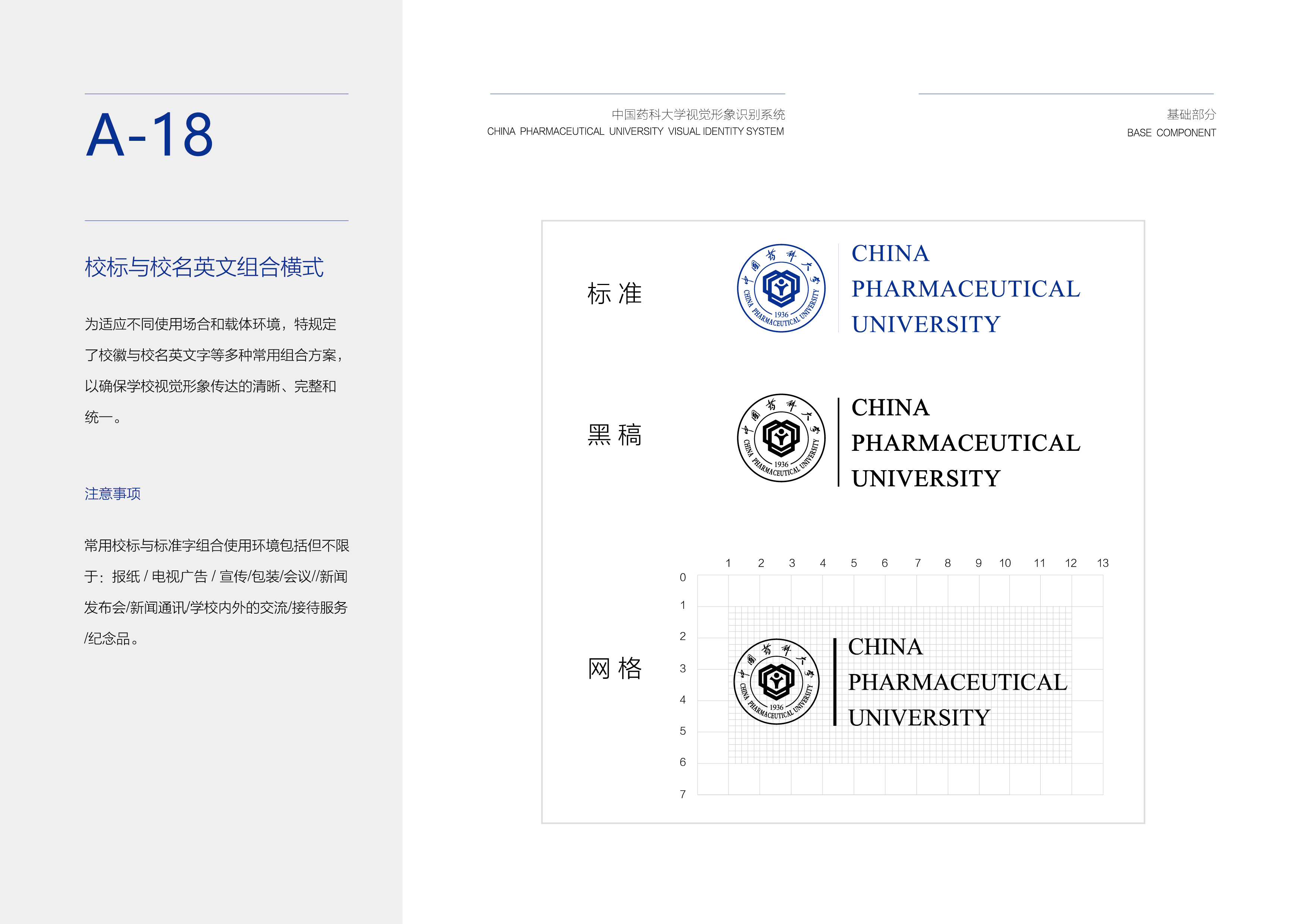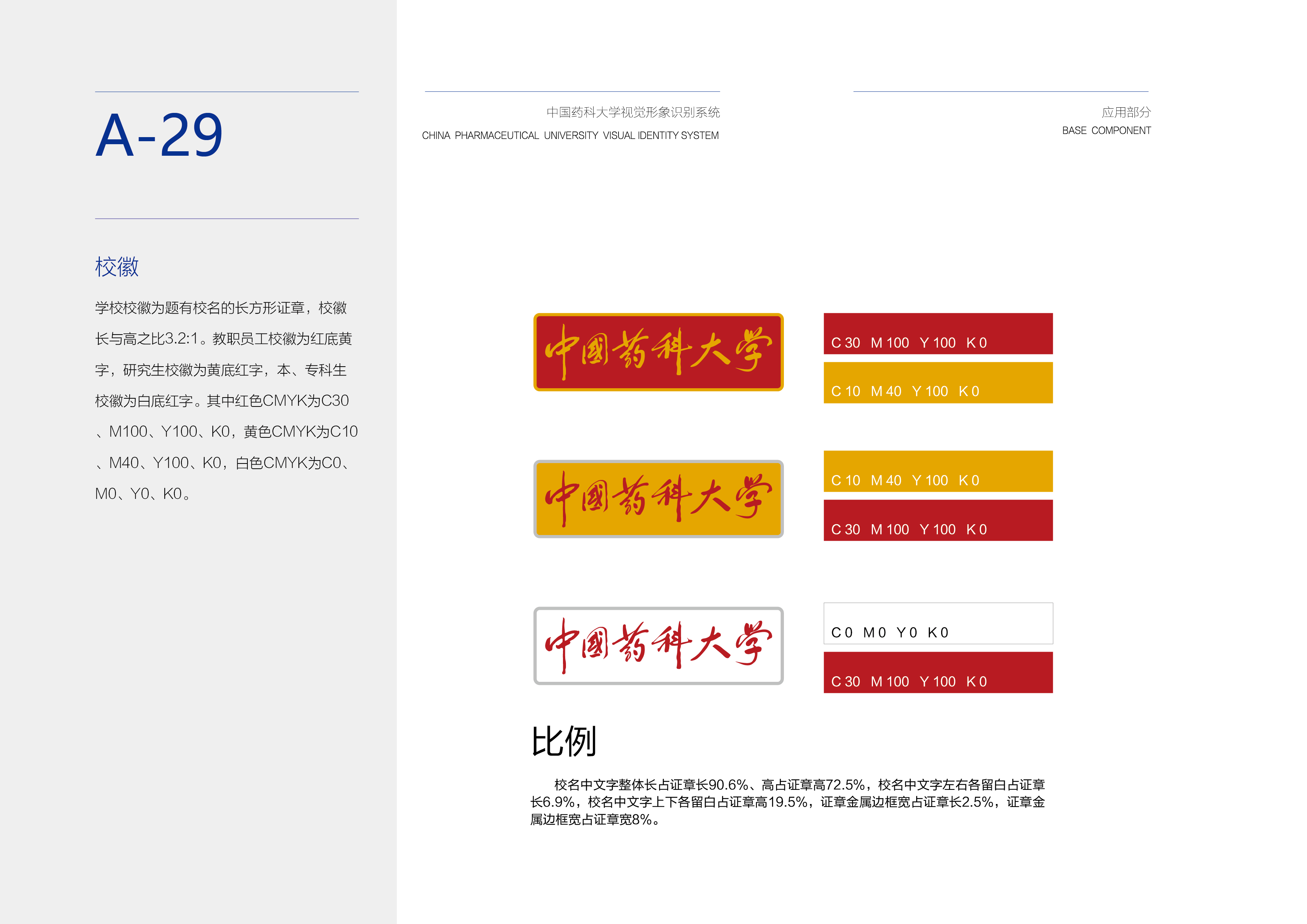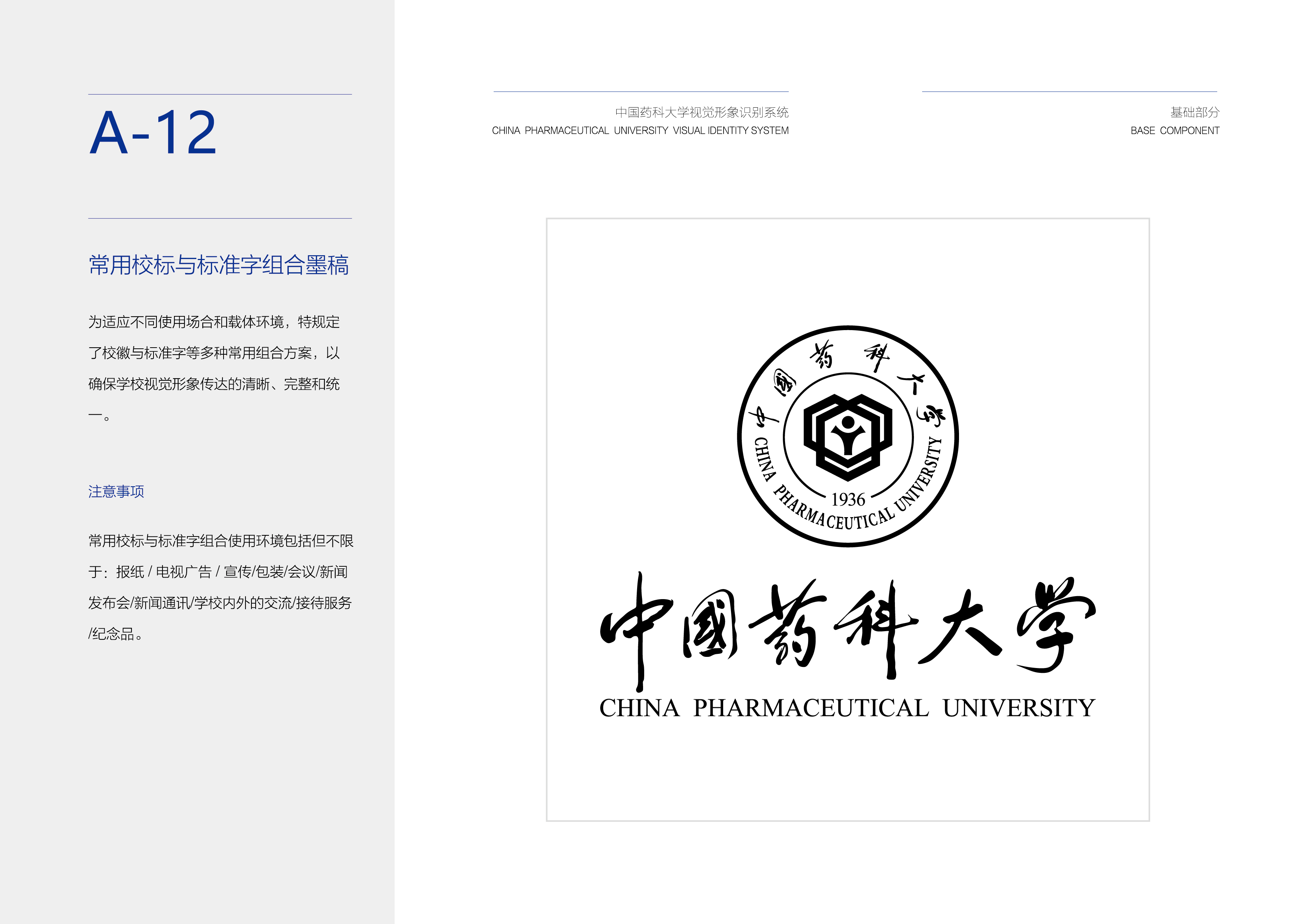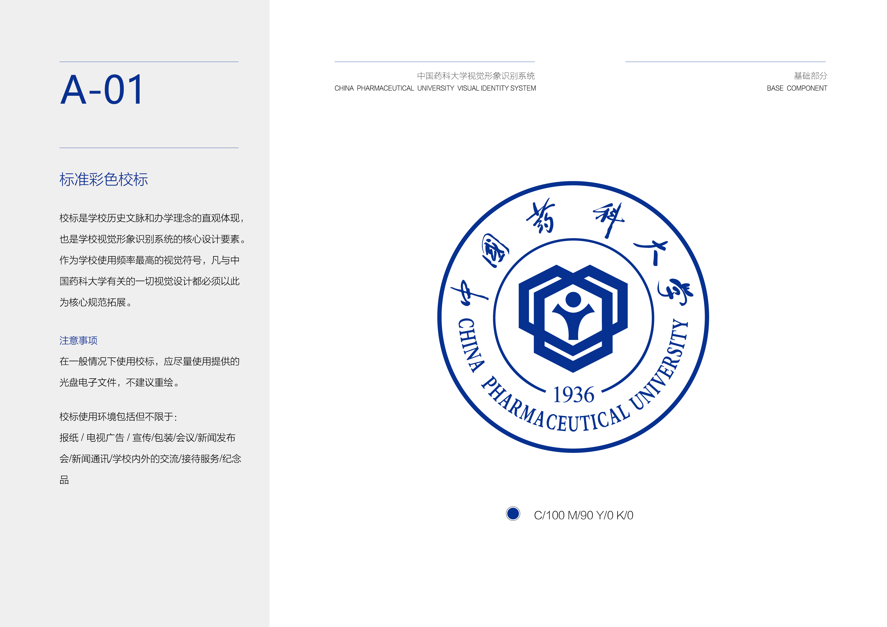 本系统内容分为基础系统和应用系统两大部分。其中基础系统包括校标、标准色、校名中英文标准字体及其组合等基本形象元素的规范性描述,各单位在使用中,应严格遵守。应用系统是基础系统在各个应用领域的使用规范总和,其中有关校标、标准字、标准色的用法也应严格遵守本系统相关规定,但本系统所列有关实际应用物品的形状、款式、材料、工艺等方案仅为示意,各单位在实际应用中可以根据具体情况酌情参考使用。