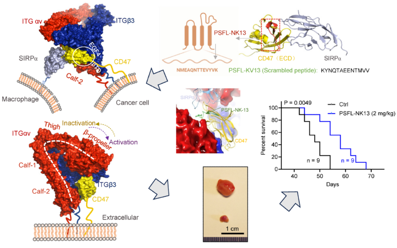 该团队证明了癌细胞膜表面高表达的αvβ3与CD47以一种特殊构象相互稳定,强化了肿瘤免疫逃逸;且基于特异性干扰αvβ3/CD47-SIRPα相互作用的策略具备安全和多肿瘤有效的特点。