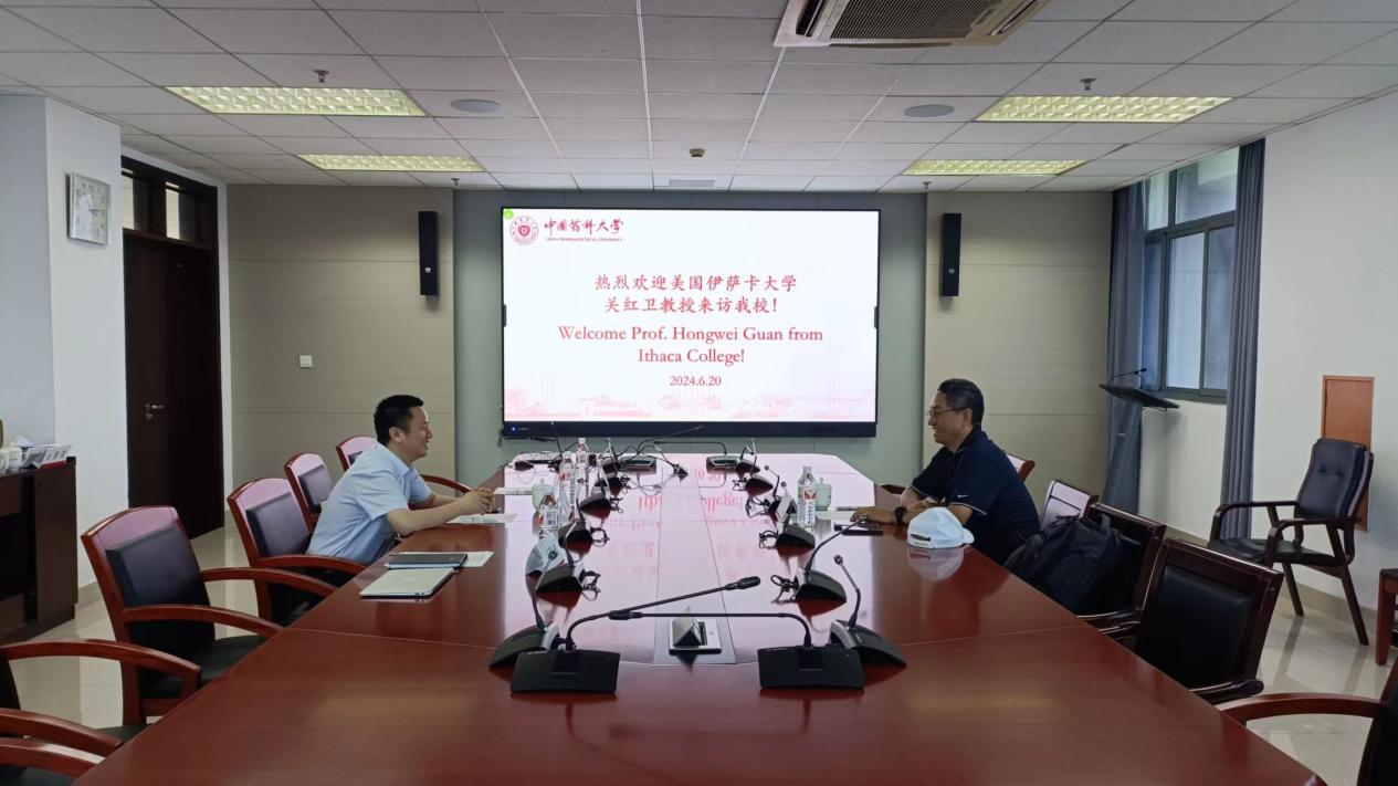 会上,徐明处长首先对关红卫教授的来访表示热烈欢迎。关红卫教授从自身从事体育文化事业的丰富经验说起,介绍了美国伊萨卡大学的特色体育专业、物理治疗专业及老年康养中心。此外,关红卫教授表示对我校开展的“锦绣江苏”传统中医药体验国际暑期学校非常支持,愿以体育文化交流为契机,推动伊萨卡大学及美国相关院校与我校合作开展深入合作与交流。徐明处长指出,体育运动与健康有着密不可分的关系,运动对药物在人体内的运作亦有着重要影响,并创新性地提出两校可从“体药融合”的角度,在学科建设、科研课题、学生交流、人文交流等多方面开展合作。双方随后在合作开展国际暑期学校、框架协议签署等方面初步达成共识。