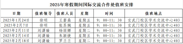 寒假期间国际交流合作处值班安排如下: