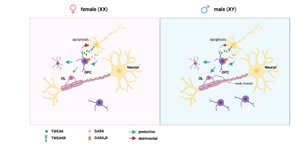 Preliminary results show that removing GABAB receptors from OPCs increases OPC/OL density of female but not male mice, during remyelination in a demyelination model. This suggests that manipulating GABABR/TWEAK signaling may help women with MS. Further research may identify novel interventions with sex-specific implications.