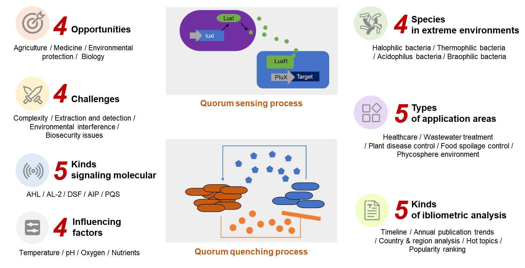 在本论文中,团队首先运用文献计量学方法,对2007年至2025年间微生物群体感应领域的研究热点和发展趋势进行了深入分析,揭示了“生物膜”和“铜绿假单胞菌”是该领域最受关注的核心主题。文章系统性地梳理了微生物群体感应的分子机制、关键信号分子的特性及其复杂的调控网络。在此基础上,本论文全面剖析了群体感应在医疗健康、废水处理、环境生物技术等多个领域的应用潜力与最新进展,并深入探讨了群体淬灭作为一种新型微生物控制策略的创新价值,以及微生物在极端环境下的独特群体感应适应性机制。