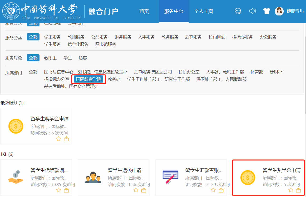 在部门中找到“国际教育学院”并点击,然后选择“留学生奖学金申请”模块