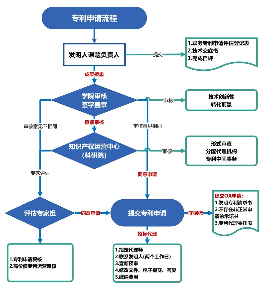 3.专利申请前评估审核:针对发明专利和通过PCT途径申请的专利,采用“项目组自评+学院审核+知识产权运营中心审核+评估专家组审核”形式开展专利申请前评估审核(具体申请流程见附件1)。