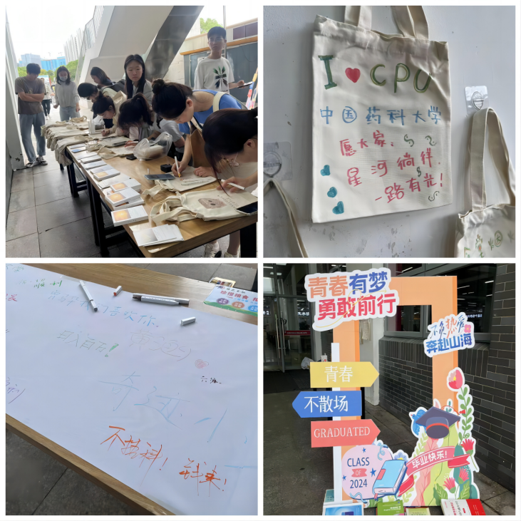 二食堂一楼以“青春有梦,勇敢前行”为主题,设置毕业打卡相框,供毕业生留念拍照;百米祝福墙布前,学生纷纷签名留下对同学、学校、食堂的祝福,也写下自己的毕业心愿;包包涂鸦活动更是吸引了同学们的积极参与,自己动手,送给朋友们作为毕业的信物。