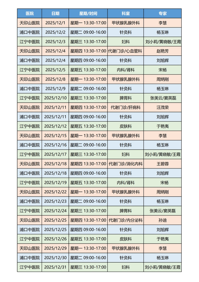 现将11月至12月专家门诊安排通知如下,请有需要的师生提前预约,合理安排就诊时间。