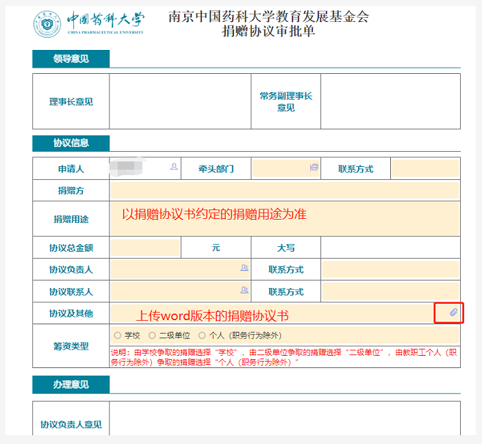 第三步:以捐赠协议书为准填写内容后发送审批: