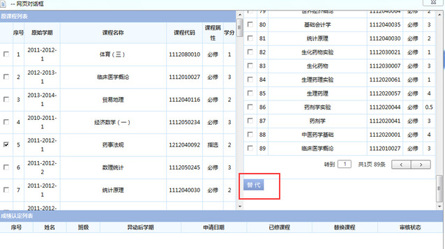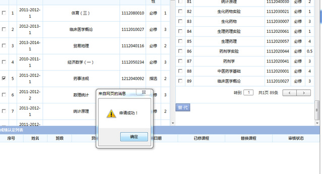 3.选择左侧的“原修读课程”,再选择右侧的“拟认定课程”,点击下方的“替代”,即会显示“申请成功”,如下图
