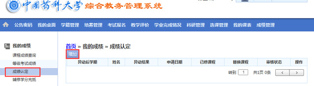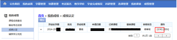 5.点击“打印”即生成一张“成绩认定申请表”,打印后,完成申请人签名、学生所在院系意见、开课院系意见后,交教务处审定批准,如下图
