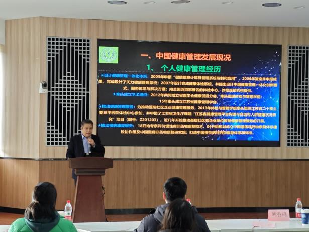 讲座中,韩谷鸣研究员以 “健康管理人才培养与职业发展的思考”为题,对我国及江苏省健康管理行业的历史沿革与现况进行了介绍,对行业需求和健康管理职业发展趋势进行研判。他就当前健康管理服务人才培养存在的问题,如服务形式化、效果不佳等,进行了分析并提出了相应的解决方向。活动最后,他与在座师生进行了深入的互动交流。