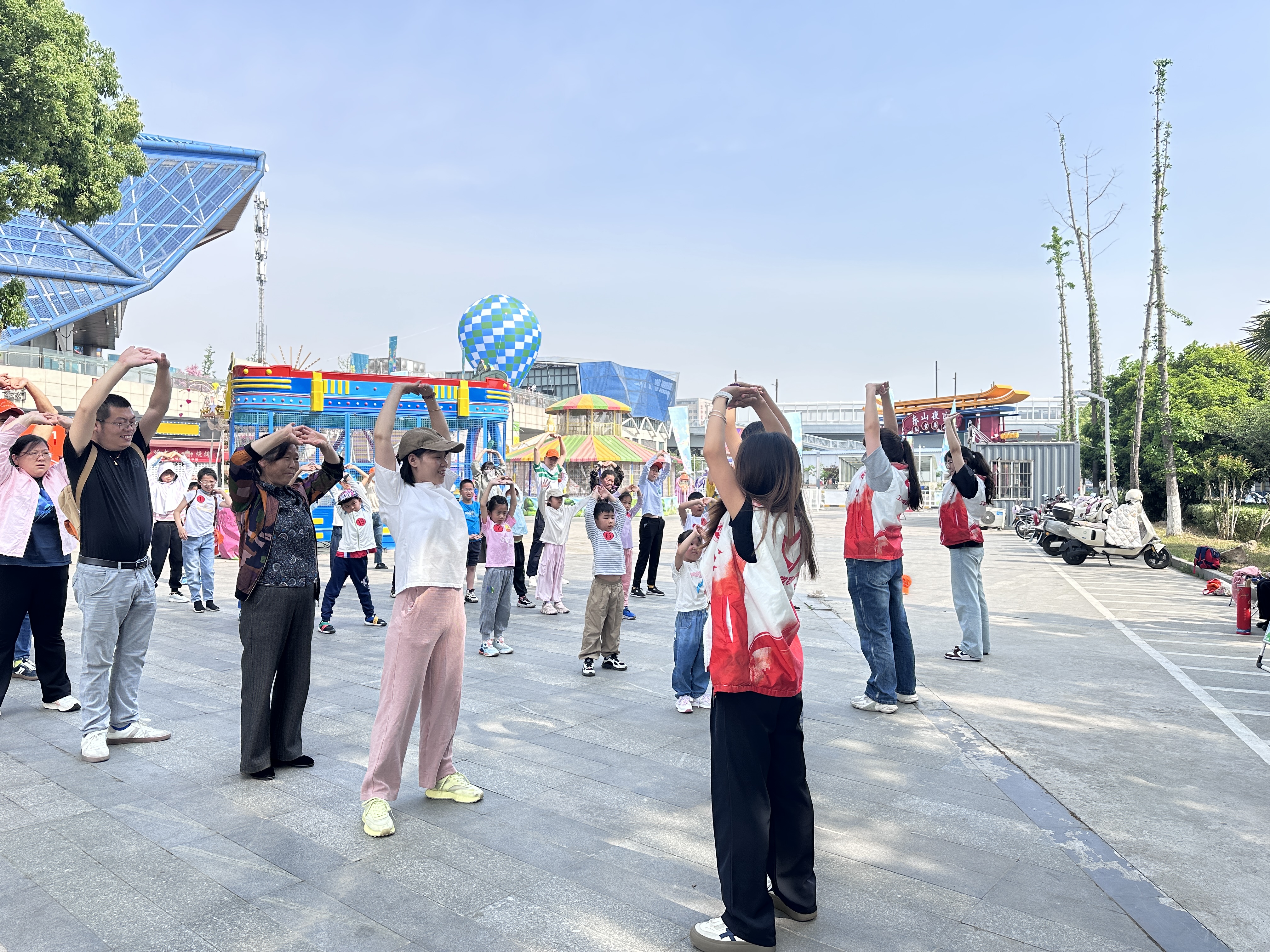 团队成员前往南京市江宁区东山街道南京耳东电影产业园,与东山街道联合开展春日绿野,走进自然亲子徒步活动。同学们基于中医养生理论,将国家级非物质文化遗产八段锦动作进行童趣化改编,设计出一系列别具特色的少儿版热身操。通过现场示范教学与亲子互助练习,使传统文化以可触可感的方式浸润儿童心灵,激发参与人员的热情。