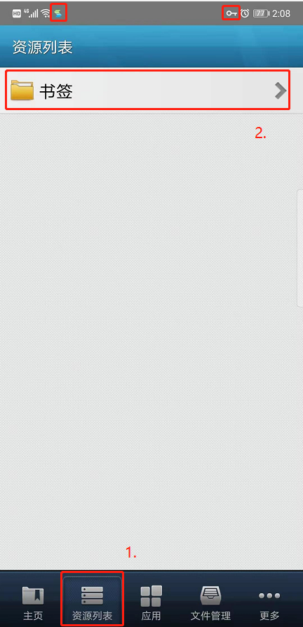 (2)手机端:手机屏幕顶部状态栏会显示客户端图标和钥匙图标,打开EasyConnect应用,点击“资源列表”、“书签”,可显示常用校内资源。