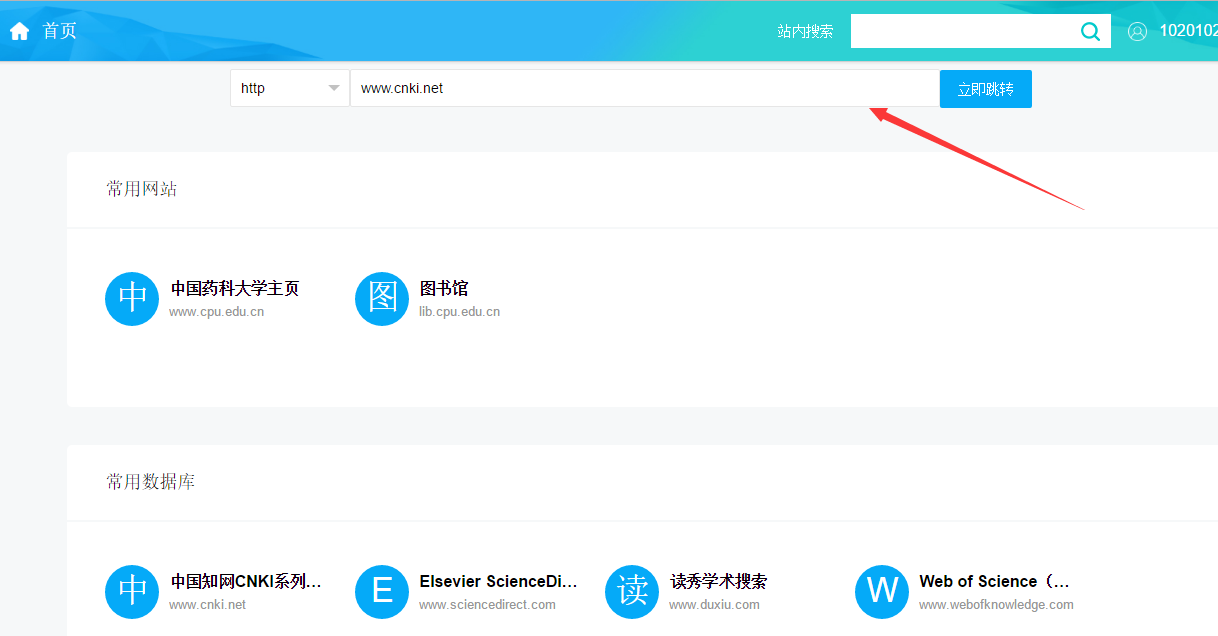 4.如需要访问的资源或系统未在信息门户中链接,可点击“校内直通车”中的“VPN”,打开VPN系统的功能界面。用户可根据所访问资源或应用的类型,选择不同的协议,输入目标域名或地址(如www.cnki.net)后点击“立即跳转”即可。
