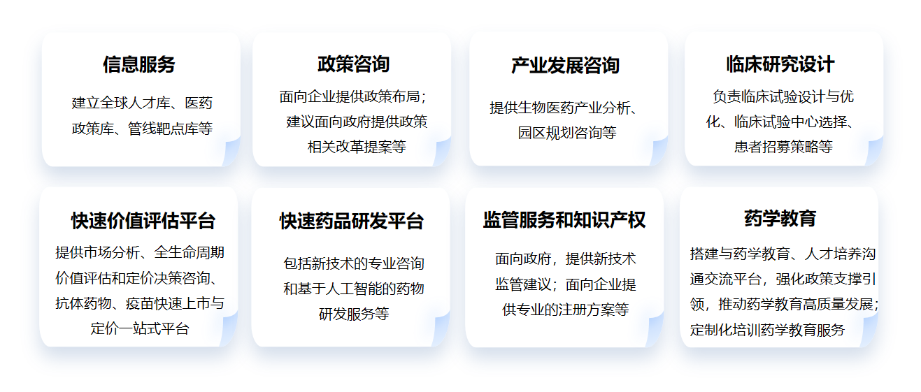 面向企业:提供针对性的高端研发咨询、上市咨询、定价咨询、临床设计咨询、策略咨询、人才咨询、基于人工智能的药物研发技术支持(包括如小分子、核酸药物、RDC、基因编辑、细胞治疗)等;