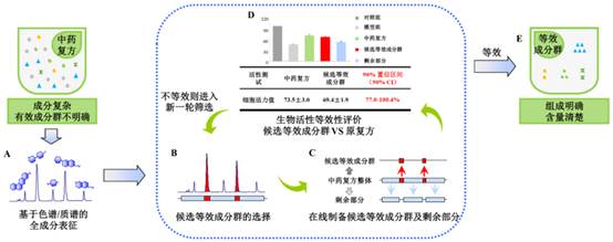 方向二:中药及天然药物活性成分(群)发现。创新中药“等效成分群”新理论和关键技术体系,为基于中药特点的复杂药效成分“解码”提供方法学支撑,回答中药复杂体系中什么成分有效。